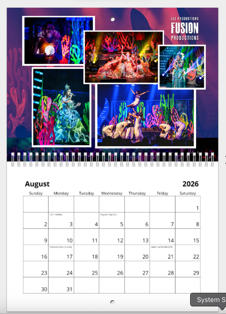Calendrier classique à reliure centrale. Ce magnifique calendrier mural (17 x 11) présente plus de 60 photos des spectacles AQUALO présentés dans diverses villes en 2025. C’est le souvenir parfait pour les artistes ou les invités du spectacle.